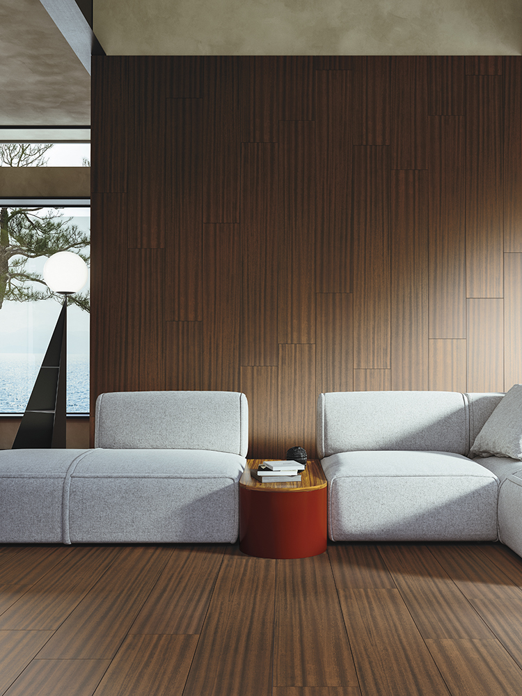 Have you ever tried to photograph all the iridescences of wood? This natural appearance of mahogany is as fascinating as it is elusive, and only in Canal Grande is it the result of meticulous research. Aiming to reproduce the play of light and shadow of luxury yacht planks, the parallel, non-uniform lines that make up the design give porcelain stoneware the same effect of depth.