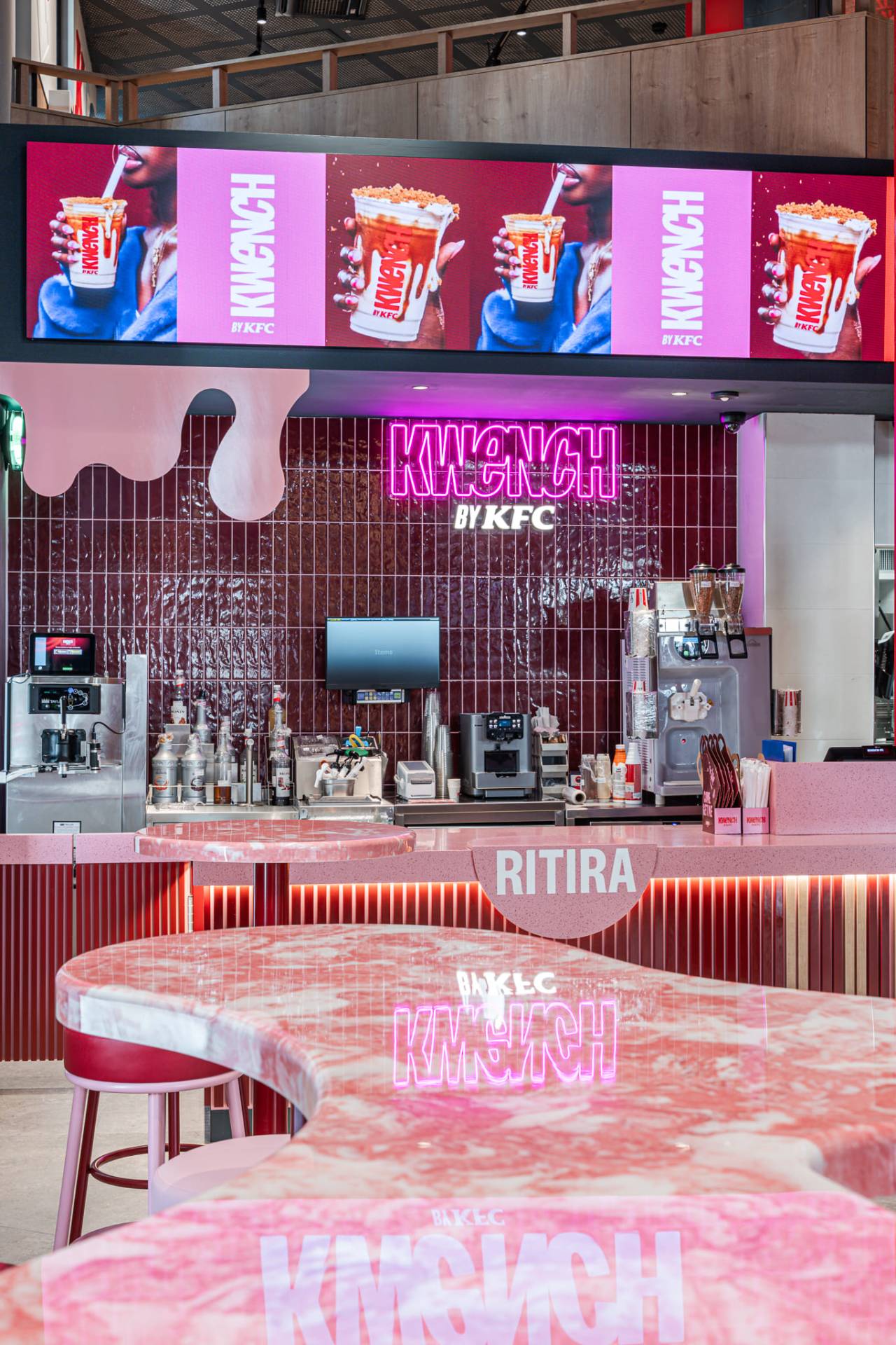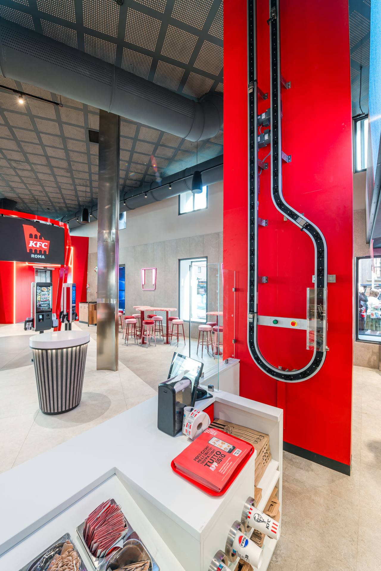 Beat is complemented by the Mold collection in the Iron color, used for the delivery area walls and to create the large contrasting circular element that characterizes the flooring of the three-dimensional 'Bucket', designed to define the ordering zone.