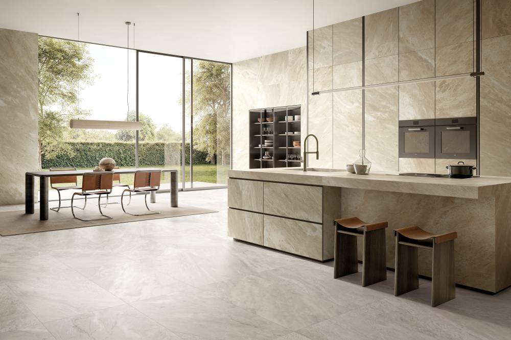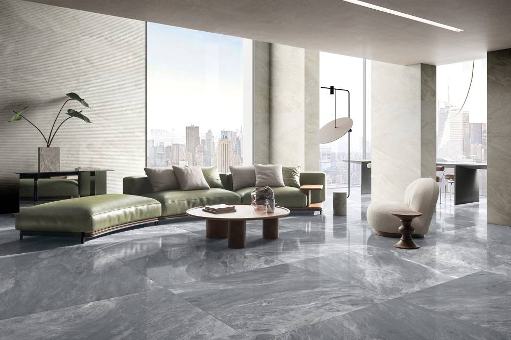 The available formats allow for maximum design freedom for applications in a wide range of residential and contract settings: the 120×120 and 60×120 formats are available in all colors, both Matt and Lucido; the 120×278 large slab is offered in Matt in the Agata and Ambra colors, and in Lucido in Agata, Ambra, Smeraldo, and Zaffiro.